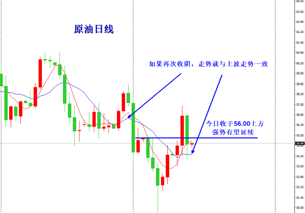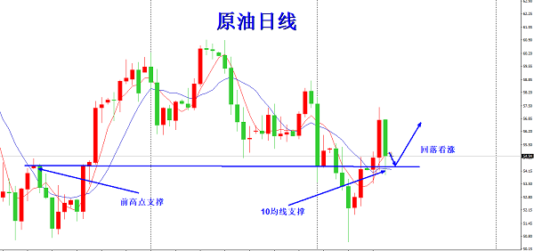 所以原油目前依托前高点和10均线的支撑进场多单,止损放在昨日回撤低点位置53.8目标我们看56.8昨日高点位置。