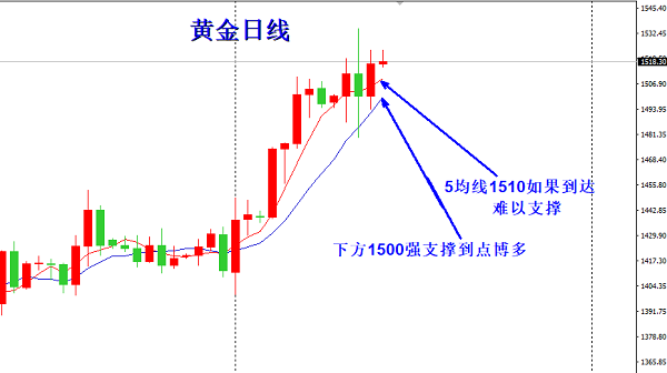 今日黄金,其实就目前来讲没有好的进场点位,很多人可能把进场设置在1510附近,此处即为前高点,也为5日均线的支撑位置,如果黄金从现价下跌10美金到达1510,那么此时的1510很难形成支撑,因为他不会给到大多数人进场的机会,如果给到大多是坑。所以如果下跌我认为会到10日均线处支撑,也就是1500一线,此线为10均线支撑,也是一个心理关卡,此时我们可以以此为支撑进场多单,止损放在1492前低点的下方。来博取凌晨的上涨。