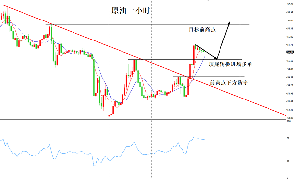 原油回落55.0-54.8多,止损54.3,目标55.7,上破看56.5