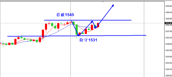 虽然目前市面上有很多人主张去做空,但是我觉得做空还是有问题的,因为目前的顶部也只是猜测,没有一个明显的做空的迹象,没有一个指标强力的提示进场空单,所以在这里不猜测1544短线顶部的形成。还是在1540附近进场一个多单,