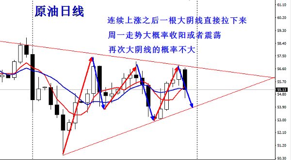 原油这波的走势,就是在一个震荡三角形中。小阳线连续的反弹,触及上方压力线,直接一根大阴线拉下来,周五的行情也是符合这个走势,由此规律来看,那今天收阳也是一个大概率,所以说55.0进场一个多单也是多点支持的,但是最好的点位还是能给到54.7一线,所以激进的55.0直接进多,稳健的等待54.7进场多单,止损统一放在54.4前低点附近。