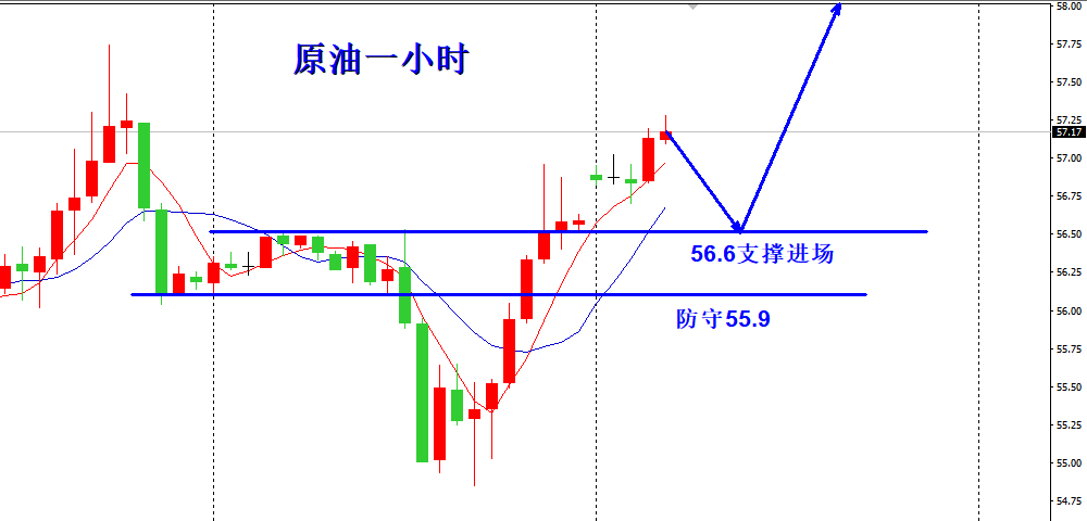 日内操我们可以去顺势博取多单,多单的进场点位,我们关注下方的支撑56.5-56.4一线,也是顶底转换位置,早间最低给到了56.7一线,差两美金即可成交,目前已经上涨至57.2一线,得之我幸,失之我命。如果上方抵到一个极限位置,我们可以进场博取个空单,目前极限位置在58.8一线,如果给到58.8一线震荡承压,我们可以进场空单博取回调,下方看支撑57.5。具体行情走势,请关注欧阳的实施动态。