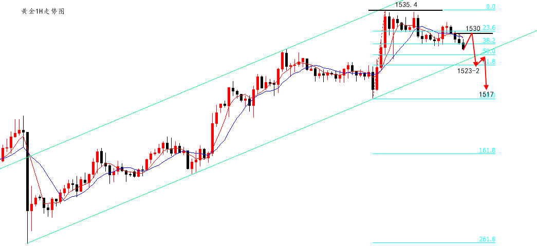 因此决定反抽做空博一下回调,上方关注1535.5高点,下方则关注618支撑1523以及1517强支撑,操作上建议,黄金,反抽见1530空,破1535.5回调1-2美金出局,目标1523-2,破位看1517!