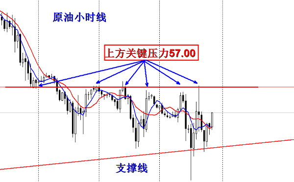 从小时线级别来看,上方56.7~57.0是一个关键的压力位置,多次反弹试探均不破此位置,反弹到此位置之后再次走跌,所以此位置我们也是比较看好,如果周一开盘持续反弹,反弹到56.7-57.0一线,我们可以以此为压力进场一个空单,止损放在57.4即可,下方我们可以看到55.5附近。