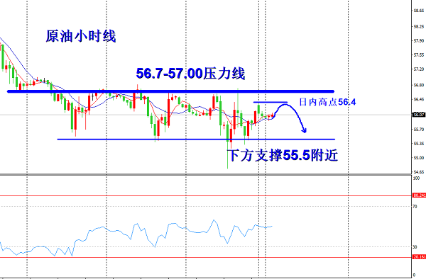原油反弹56.7-57.0空止损57.4,目标55.5破位持有看新低。