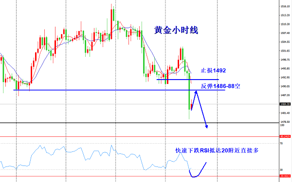 黄金美盘前开启了弱势下跌,力度非常大,1490和1487两支撑一根阴线全部击穿,多头直接梦碎。RSI从15分钟看,已经超卖,短线会有一波反弹,如果美盘前反弹到1488附近,可以继续进场空单,目标我们仍旧是看到低点1475附近,由于今日走了一个倒V型反转,当1490一线破位之后,下方会迎来更猛烈的下跌,下方至少有12美金的利润,因为力度会大于V型的涨跌,美盘最低也是给到了1489也是有11美金左右,和预期完全吻合。