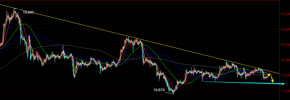 昨日白银很明显的一点,价格又一次触碰日线通道强压17.75附近,因此提出17.7继续做空,好位置一定要敢于空,而上周17.8空中线一直持有中,昨晚也展开了弱势连跌至17.3,利润上还是相对不错的,对于今日来讲,也黄金一样,小时线连跌向下,今日亚盘震荡反弹,午后也要继续博空,阻力17.53-17.57触及空,或者按时间原则,15点前后触及不了,先做空一部分,下看17.3,乃至17;
