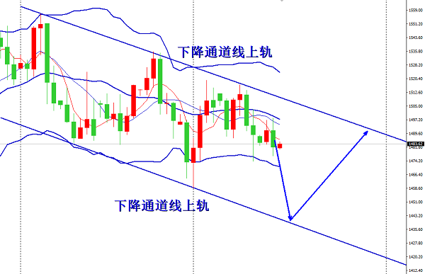 黄金从大级别来看,目前依旧处于下降通道线之中,之前多次讲到的下降通道线依旧有效。自上周三上方反弹确认1517下降通道线上轨线之后,一直处于回落的行情,目前从布林线来看,也有收口和向下发散的迹象,所以整个大趋势在昨日下破1488之后,有略微走空的趋势,并且昨晚收盘出现于1482附近,收线位置也较低,昨天晚间就有提到,如果出现于1488的下方,那么今日大概率还是一个弱势的行情。所以目前的初步计划依旧是逢高做空为主。