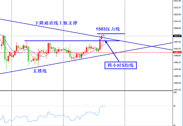 黄金目前从4小时走势来看,已经破位了下降通道线的上轨,昨天下降通道线上轨的压力在1501一线,昨天美盘时段直接向上突破了上轨压力,受压于前高点一线1503一线,目前震荡于1501附近。突破之后下降通道线的上轨将作为一个支撑,也就是我们常讲的顶底转换,此支撑在1501。强势的延续,1501的支撑起到一个关键作用。黄金在下降通道线之中形成了一个震荡三角形区域,此震荡三角形自10月1号开始成立至今已经有快一个月的时间,我们常讲“横有多长,竖有多高”,震荡时间越久也就意味着筑底的越牢靠,上涨的的动能也就越足,所以在此走势下我们暂且不考虑做任何空单,而是以逢低做多为主。