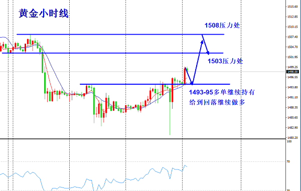 操作建议:黄金早间现价1495-93的多单继续持有,上方给到1508空止损1512目标1498。