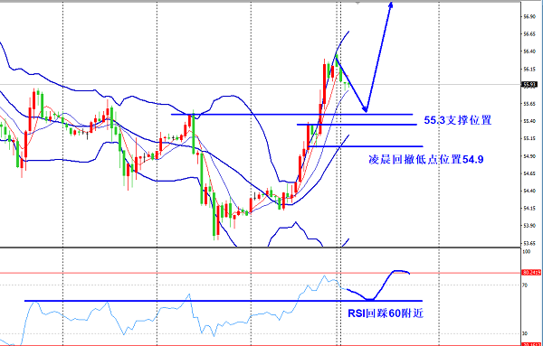原油下方回撤55.5~55.3多,止损54.9,目标56.7,破位看57.7.