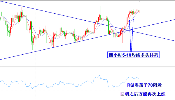 这里需要注意的是1512/13我们不进场追多,因为从4小时级别来看已经处于一个强压之下,4小时RSI几度超买抵达70一线,所以必须回撤修正之后才有可能再次上涨,才可能具备击破1520的压力线。目前早盘直接上涨并冲破1520概率极小,所以也就不用激进的直接现价进场。由于4小时震荡已久,目前5-10均线粘合,属正常情况。4小时直接上冲,缺乏一定的支撑,也缺乏动能,所以早盘我们不着急参与,回踩给到1508-06一线我们进场多单。