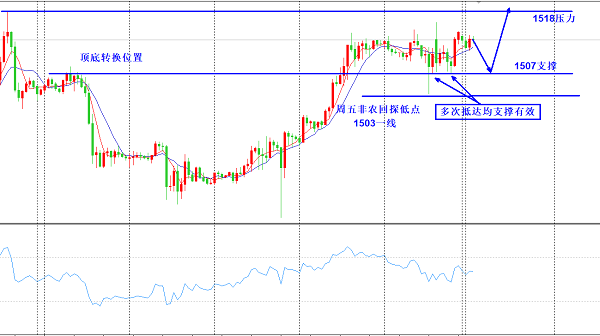 黄金我们从小时线级别看到下方的支撑在1506附近,在周五非农行情中多次试探此位置的支撑均没有破位支撑,而唯一一次击破此位置抵达1503,是在非农数据刚刚公布之后,快速击穿,但是并没有过多停留,而是直接反弹受收线于1506的上方,所以下方1506的支撑我们还是比较看好。而1506又是上周一反弹的高点,所以以此位置为顶底转换进场,多单相对来讲比较稳健。而下方的防守我们放在1503一线,1503我们知道它是上周五非农下探的一个低点位置,我们以此低点为支撑进场多单,上方目标我们在周评中不断讲解,反复论证,高点我们看到1520一线,1502既是日线级别的压力,也是4小时级别的压力,多次试探此位置均没有突破并站上此位置,足以说明此位置压力之大。