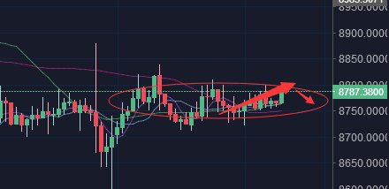 昨日的行情成功站稳了8700,晚间的一波洗盘,将比特币拉升到8810附近一线,然后又快速回落,行情继续震荡下行,最低点下到8830附近,不过也迅速反弹到压制位,行情目前再此震荡运行再8750附近,从整体走势来看,趋势仍旧偏震荡下行,下方MA10和MA30所在的位置附近,也有支撑压力,但是多头的能量仍在找机会发力,现在主要上方关注点支撑和阻力的破位,如果行情突破8800,且稳定再8800一线之上,行情可能还会再次向上破位。
