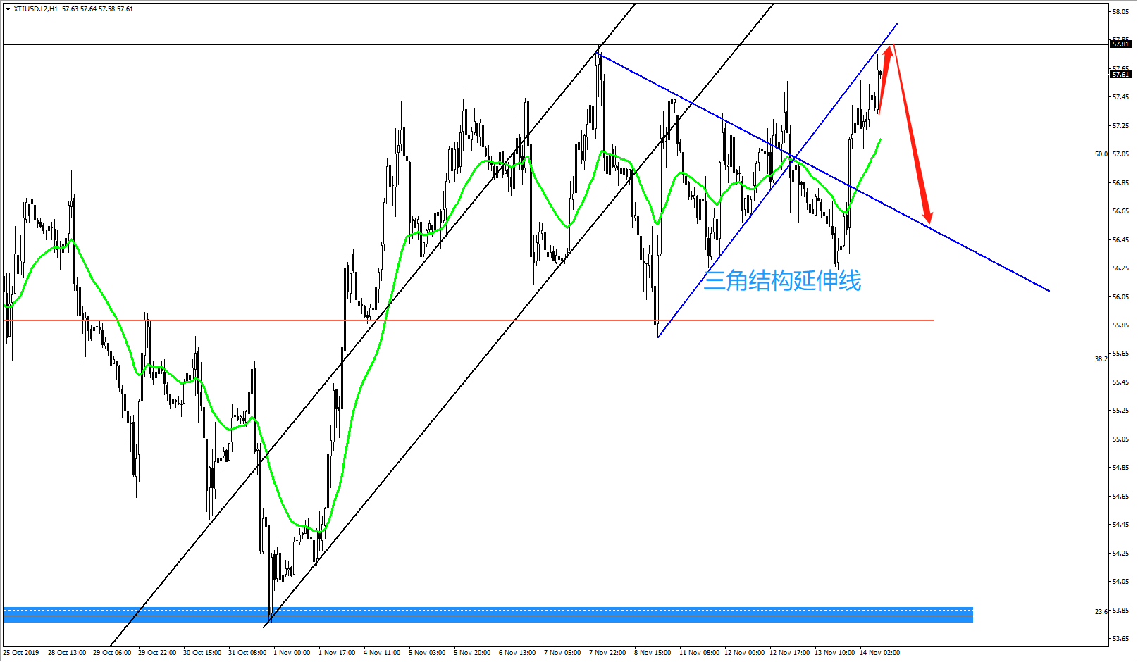 近期原油一直在顶部进行盘整,目前在运行第八个顶部,且在不破前高的情况下,原油必将有大幅走跌的需求,但就算破位,我预期也是虚破,上方不能企稳57.8一线,那么依然看空原油!毕竟目前造顶的迹象已经非常明确了,技术面我找不到看多的想法,除非此次先行给到54.2一线,后市继而进行新的结构运行!