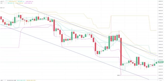 BTC四小时走势图中,走势逐步在布林带区间内站稳,价位也在MA5附近调整,虽然仍遭遇着上方空头阻力的影响,均线呈空头排列,向上力度仍不足,但走势逐步在8400一线企稳,后续也将有给到反弹的契机,附图MACD指标有走平的迹象,STOCH双线在20水平线下方相交粘合,RSI指标在20水平线有抬头的姿态,后续走势将处于震荡调整的趋势中,从今日的短期走势来看,多头并未有效的动能,局势已经形成,市场情绪仍然是空头占优,只是多头量能缺乏还未触及到关键的阻力区域释放空头压力,所以局势暂时维持着调整的姿态,而日线图上,压力仍然是十分强势的,向下的风险依旧较强,整体建议以空为主,反弹即是可以做空的时机,破位之后再无关键的支撑影响是很难撑起一个有效的反弹,所以局势仍有下探的可能,近期的走势仍处于弱势整理区域。