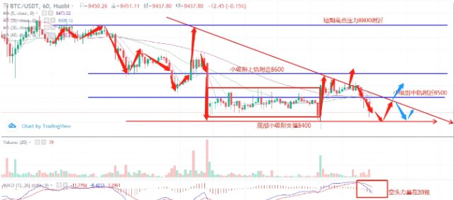 BTC冲高回落振荡走势再次开启BTC昨日凌晨之后才迎来第二次拉升8620,虽然比较纠结,但还算给力,对于二次安排做多的目标刚好到达。随后走出承压后下行,目前最低触及8450附近。运行的区间依然有效,短线来看8400的支撑暂时有效,上方8680-8650压力下振荡,日内防止插针后引发拉升!技术面4小时倒锤头阴线,冲击上轨附近承压,结合前面走势,多次承压于30日均线有效,早间开盘周期中换线于中轨下方,承压于中轨展开小幅回落下跌。布林带达到逐步收口的状态,振荡周期仍未结束。