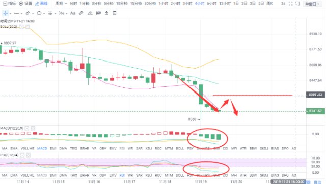 前面的分析中就说过下方8000附近是有支撑的,在凌晨的下跌后明显受到8000的支撑反弹,这次反弹的点位个人认为不会太少。从小时图和四小时图可以看到,目前附图指标RSI严重超卖,MACD运行在0轴下方,四小时图有短期的底背离现象,这些都是短期的一个反弹的信号,个人预计短期会有上涨反弹的行情出现。不过从日线图来看,下方还有一定的下行空间,重点关注月线MA10均线7800附近的支撑。那么下方重点关注8000重要支撑位,短期支撑看8100-8200附近,上方重点关注小时图布林中轨8400附近的压力位,也是四小时图ma10均线的压制,和四小时图布林中轨8450附近的压制,防守压力位看小时图布林上轨8600附近,这也是四小时图布林上轨的压制。