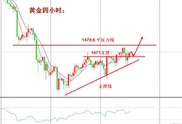 从4小时来看,自本周一探底以来,快速的拉升之后,10均线其实在此波行情中未受影响,依旧配合着日线级别的多头向上排列,其中5日均线来回穿梭,目前5均线下穿10均线,而价格处于5-10日均线的上方,此走势我们称为指价背离。此时一定要关注收线情况,收线于均线上方,一根阳线直接吞没之前的下跌,此时仅仅是震荡修正,绝非见顶。日内多头还是比较强势,所以此时我们就需要等待回落,给到回落之后去布局多单,下方关注四小时支撑1471给到此位置我们可以进场多单,下方见1468直接加仓进多,止损我们统一放在1464一线。而上方1479一线的压制下,多次试探均不破位。今日再次给到此位置,我们就要关注此线的压制情况,如果二次反弹再次冲击仍不破位,我们便以此位置为压制进场一个空单,也将此行情当做区间操作即可,这里需要注意的是,二次反弹不破位,此时则为进场空单的机会,毕竟大级别依旧看多,做空需要谨慎对待。