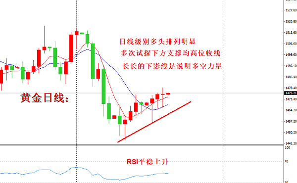 黄金在本周已经连续三天在凌晨探底回升直接翻盘,所以从日线级别可以看到,本周已经连续三天日线收线,收到一根长长的下影线,对K线图了解的朋友都清楚,下影线越长,那么说明多头强于空头(不管收阳线还是阴线),空头易攻难守,下破快,力度很大,但是后程乏力,无法守住下跌。我们可以看到周二周三都是下跌至1465附近,而此位置刚好是日线级别10均线的支撑位置,以此为支撑强势反弹,由于凌晨收线较高,所以目前5-10日均线依旧呈现多头排列的趋势,未受日内下跌的影响,整体大方向依旧是看多不变,其中多次的日内震荡,从日线级别来看,完全可以忽略不计。