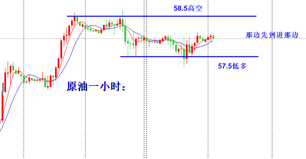 从一小时来看,昨日美盘快速下探57.2,并支撑于此位置反弹,57.2刚好是此前上行情中的一个高点位置,昨日快速下跌没有击穿此位置,足见此位置支撑之强,支撑于此再度反弹,目前,我们亚欧盘还是和昨日早间一样先行做多,如果未能上涨,美盘我们再做调整,下方做多点位,我们看57.5一线,此位置是周五试探的低点位置,也是昨日大阴K线实体的底端,并且是日线级别下方10均线的支撑,所以我们以此为进场,止损放在昨日低点附近,先行布局多单博取亚欧盘的上涨,如果上方突破58.5,那么将有机会继续上涨,如果压制于此位置,那么我们将在美盘时分考虑出掉多单反手进空。