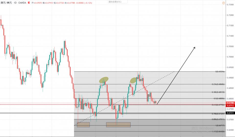 澳元日线级别出现技术面做多交易机会:奥美(AUDUSD)双底回撤0.618.现价0.678进场做多止损0.673目标0.705持仓周期15交易日