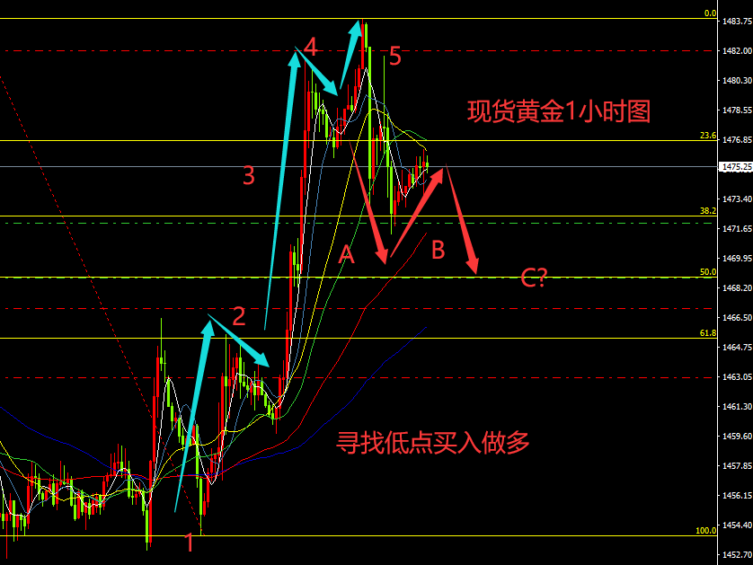再从技术面来看,昨天1小时图出现了标准5浪上涨,如上图,3浪特别长,5浪加速完成后回落,目前走了A和B浪,因为A浪回调比较充分,那么C浪的深度会小一些,我们黄金分割来找入场点,留意一下1469美元,日K线5日均线支撑在1470美元;