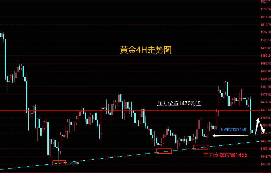 1:当前黄金下跌4小时共振支撑位置1458一线,暂时止跌修正,预计日内会在4小时支撑这里短暂的反弹修正。重要压力位置1470一线.