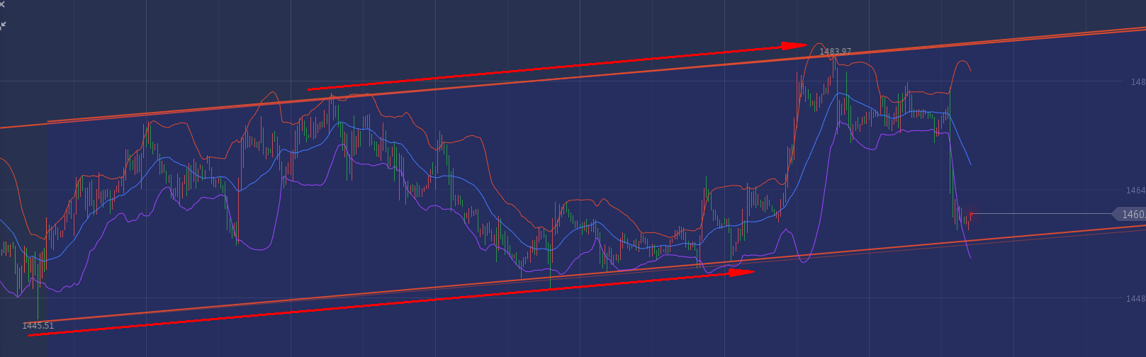 黄金上周五支撑在1459附近震荡多时未能下行,今早开盘延续震荡,看小时图已经连续三阳,非农利空大跌后有所超卖,因此周一没有延续非农空头行情,日内建议现价61附近直接做多单,关注日图布林中轨压力1465的阻力情况。从小时图的价格通道来看,从近期最低点1445作为起点,可以与周五的低价链接,下方的多次低价基本可以连成一线,而上方的高价1484就是阻力价格,所以本周只要不突破1458±2美金的情况下,我认为逢低做多,见1490没有问题。