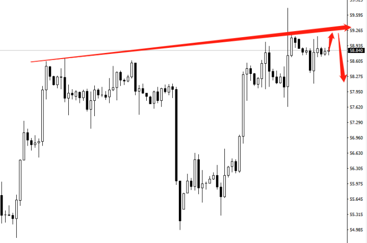 原油现价处于58.84位置,如果在此文章进场,做单的思路就很简单了,带好自身的止损,此位置进场我止损会放在59.45位置附近,这个位置处于布灵带上轨的阻力位和趋势线的阻力位,是每位空头朋友止损位置的不二选择。