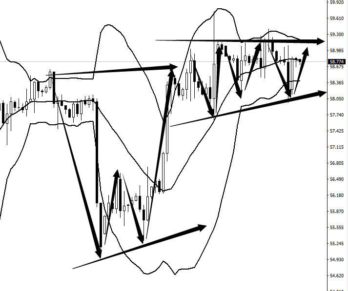 通过原油近期的走势,震荡缩小,回到了59.25~58.051区域,当前的原油趋势,整体是上升趋势,所以也是我今日看多原油的原因之一,K线落在布林带中轨支撑,给了原油上涨的动力,所以今日目标很简单,看到59.12,止损我看58.55.