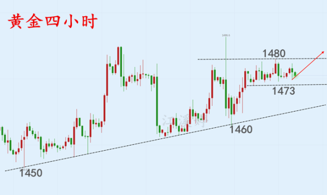 综合四小时图,在中期看涨的同时,我们需要堤防短线调整后再涨这种走势;日线连续收星线,并且受阻趋势压力1480/2之下。如若不能上破1480/2区域压制,并下破1470-65,行情将二次探底,即:向下测试1445以及日线通道1440/35区域支撑。因此,操作上以1470以及1465为防守做多,目标1480/2突破看涨1487-90以及冲击千五;如行情跌落1465则短线多转空,做空看跌1460破位至1450区域全部平仓;然后等一轮格局出现看1445抄底及上1480以及千五以上!
