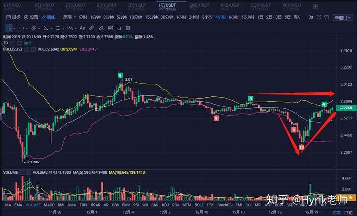 HT:走势相当强势,目前依旧抗跌走自己的行情中,只要大饼后期走稳反弹,有望再次跟上,建议持有自己仓位,下跌看好的支撑追加补仓就好了。