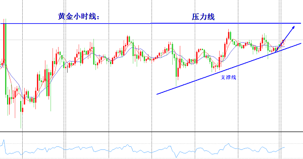 从日线级别来看黄金自上次1450一线反转之后,10日均线在后边几日反转之后,虽然没有出现强有力的向上势头,但是一直是斜向上连续支撑黄金上涨,而在上周也是以5日均线为支撑,虽然在日内多次刺探5日均线,但是均收线于5日均线的上方,所以上周的操作基本上都是以5日均线为进场,而以10日均线为防守,这样的操作虽然利润不大,但是连续操作绝对不会出现亏损。所以在操作之中,虽然我们以一小时定进出场,但是我们更应该结合日线以及4小时线去判定趋势,根据趋势去操作,这样相对来讲可以将风险控到最低,因为顺势单子有无数次出场的机会,而逆势单子基本就不给出场机会。