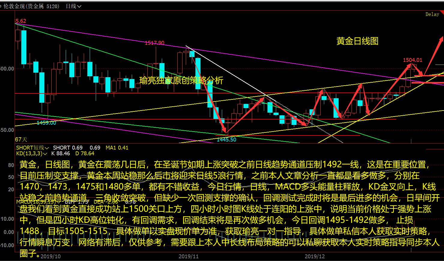 黄金,日线图,黄金在震荡几日后,在圣诞节如期上涨突破之前日线趋势通道压制1492一线,这是在重要位置,目前压制变支撑,黄金本周站稳那么后市将迎来日线5浪行情,之前本人文章分析一直都是看多做多,分别在1470,1473,1475和1480多单,都有不错收益,今日行情,日线,MACD多头能量柱释放,KD金叉向上,K线站稳之前趋势通道,三角收敛突破,但缺少一次回测支撑的确认,回调测试完成时将是最后进多的机会,日早间开盘我们看到黄金直接成功站上1500关口上方,四小时小时图K线处于连阳的上涨中,说明当前价格处于强势上涨中,但是四小时KD高位钝化,有回调需求,回调结束将是再次做多机会,今日回调1495-1492做多, 止损1488,目标1505-1515,具体做单以实盘现价单为准,获取瑜亮一对一指导,具体做单私信本人获取实时策略,行情瞬息万变,网络有滞后,仅供参考,需要跟上本人中长线布局策略的可以私聊获取本人实时策略指导同步本人圈子。