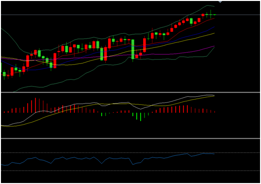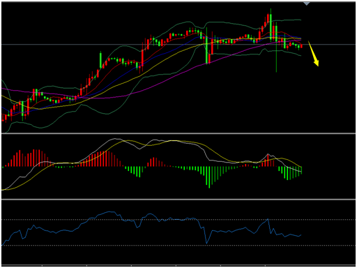 上图为原油的日线图,原油连续两日高位收十字星阴线尤其昨日更是形成反噬阴线,表明油价暂时上行受阻。同时Boll带由扩张状态转为收敛之势,MACD量能柱开始减弱,RSI动能指标开始向下运行,短期内进入调整的可能加大。