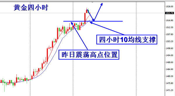 黄金今天整体还是偏强势,早间直线拉起之后,亚欧盘稍有所上涨,试探1525之后短线开启回落,也是技术上的回调,一小时、四小时、日线都已经严重超买,所以上方空间不会太大,必须 走回调之后再次拉升。目前从4小时来看也是严重偏离5-10均线,下方5均线的支撑在1519附近,我们晚间需要关注的是1516一线的支撑,此位置既是震荡区间的高点位置,也是下方四小时10均线的支撑位置,如果晚间给到此位置,我们可以直接进场多单。晚间如果在美盘前快速回撤给到可以进场操作,如果时间太晚那么就不操作了,因为明天全天停盘。