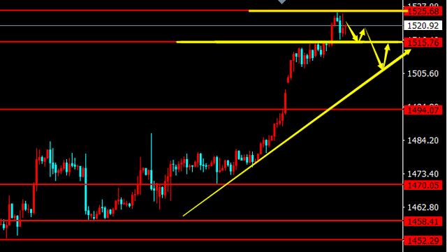 则晚间黄金可直接于现价1521附近做空,目标看14-08附近,损1526。