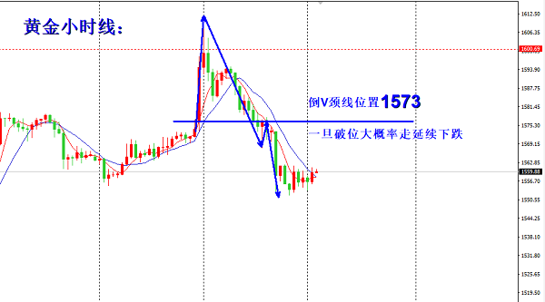 首先昨日黄金在避险情绪的影响下直接大涨,拿下1600高点,创下7年之前的新高。在回落之后当下方破位1578一线的时候,其实多头基本上已经宣告结束,只是我们身在其中难以拔出,因为我们可以看到,1578是本周跳空之后反弹的高点位置,当此高点位置一旦下破之后,那么上涨行情已经出现了极度的回调,而这种大力度的回调已经不再具备上涨的动能,当回调过大的时候,就已经说明上涨困难了,所以反弹之后就要找位置做空了,而不是一味地找位置做多。而昨天我们也是受到避险情绪的影响,也是整个亚盘都在找位置做多,直到美盘向下测试破位1571,之后此时才完全清醒过来,可是很多人还是幻想着重新站上千六,其实此时已经不可能了,因为我们可以看到1571是日内起涨点,当一天的起涨点破位之后,并且此前行情拉升较高,那么此位置一旦破位,此时的日内走势就演化成“倒V走势”,颈线就在1572附近,一旦破位之后,那么下方还存在着较大的空间,所以在美盘前我们给出了1571~73进场的空单,果然在凌晨迎来大跌,下方最低抵达1552,而1552刚好是本周跳空高开的位置,也就是上周的收盘位置。
