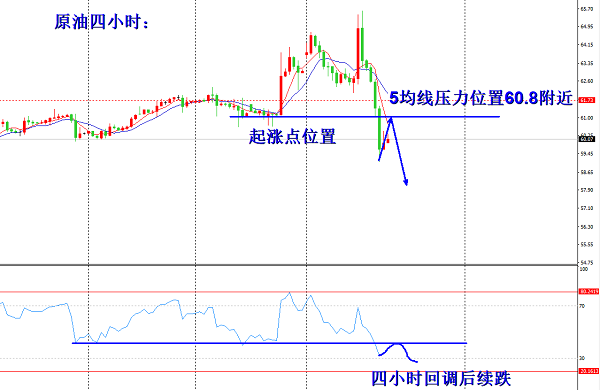 昨天黄金走势凶猛不言而喻,但是相比于原油还真是稍有逊色,原油昨日最高到65.5而最低抵达59.0,全天走等同于黄金的55美金全,显然比黄金更加猛烈。全天以大阴收线,这种极弱的下跌,势必会影响今日的走势,所以今天稍给反弹之后还是大概率会走延续下跌,而今日反弹上方的压力我们看60.8一线,此位置是4小时5均线的压力位置,首次触及此位置,我们可以进场空单,因为上方的61.00一线也是上升过程中回落的低点位置,也是之前的大阳k线的起涨点位置,所以60.9位置也是有一定压力的,所以今日操作上方反弹60.8直接进场空单,防守我们放在61.3此位置是一个顶底转换位置,我们以此为防守去操作此空单,目标我们下方可以看到59.00,也就是昨日的低点位置,破位此位置之后将直接看向58.1附近。