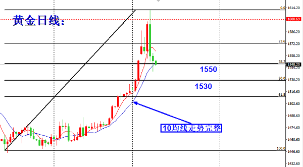 黄金我们目前从大级别来看,虽然快速的回落,但是整体上走势依然保持完整,日线级别10日均线,依旧是有支撑,虽然昨日向下破位十均线,但是收线较高,所以十均线的走势依旧是没有受到影响,加之之前上涨颇多,所以要想把10均线拉下来,也是有一定难度的,我们可以从日线级别的非波纳契线中可以看到,目前震荡徘徊于0.382一线,刚好此位置也是10日均线的支撑位置,而下方0.5的位置在1530附近,所以今日回调下方的支撑在1530是有相当的支撑,短时间难以到达0.618的位置,此置绝对是此次回调的重要支撑位置,因为此位置不但是前下跌反弹前高点位置,而且是上涨过程中震荡的位置,此位置在1510附近。
