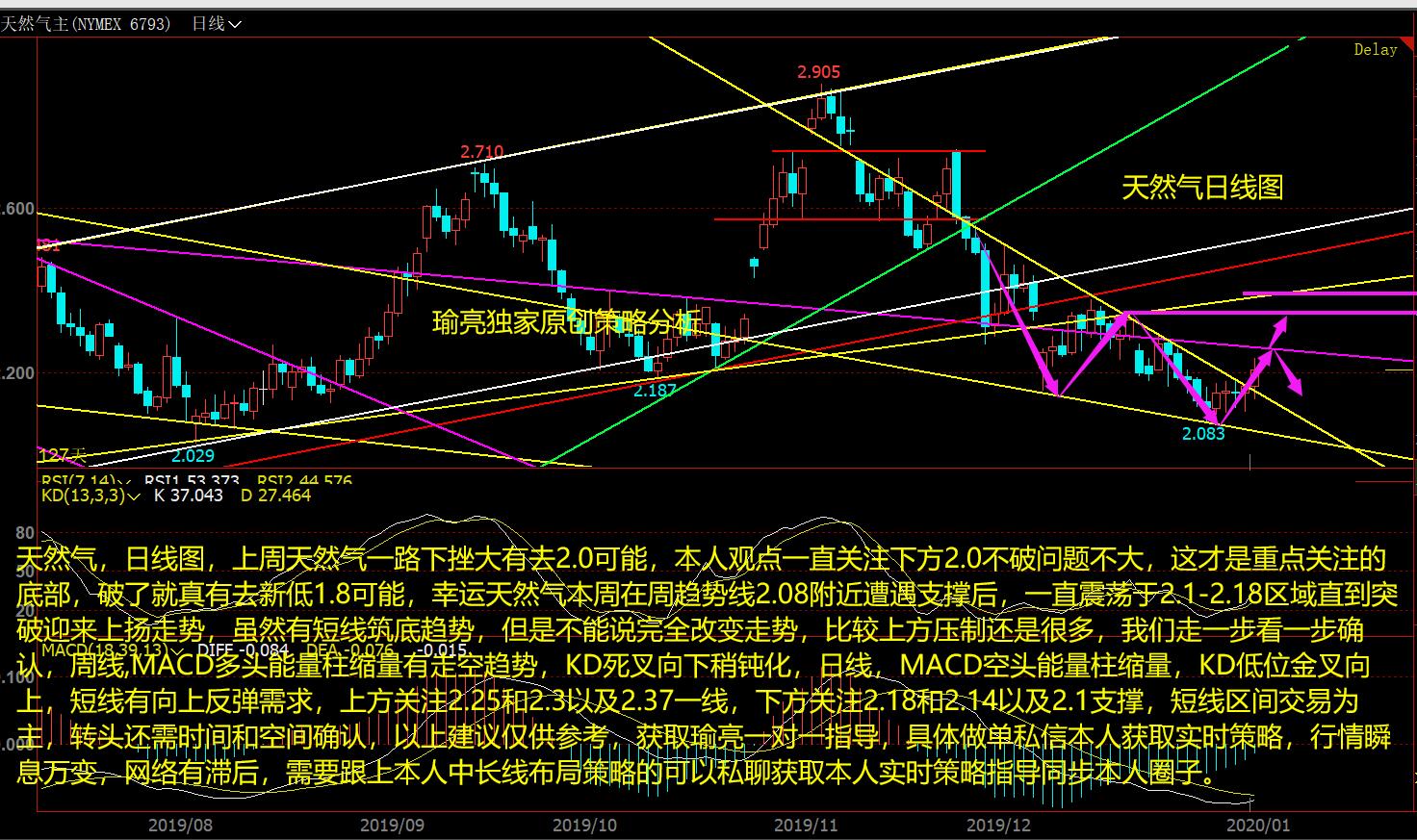 天然气,日线图,上周天然气一路下挫大有去2.0可能,本人观点一直关注下方2.0不破问题不大,这才是重点关注的底部,破了就真有去新低1.8可能,幸运天然气本周在周趋势线2.08附近遭遇支撑后,一直震荡于2.1-2.18区域直到突破迎来上扬走势,虽然有短线筑底趋势,但是不能说完全改变走势,比较上方压制还是很多,我们走一步看一步确认,周线,MACD多头能量柱缩量有走空趋势,KD死叉向下稍钝化,日线,MACD空头能量柱缩量,KD低位金叉向上,短线有向上反弹需求,上方关注2.25和2.3以及2.37一线,下方关注2.18和2.14以及2.1支撑,短线区间交易为主,转头还需时间和空间确认,以上建议仅供参考,获取瑜亮一对一指导,具体做单私信本人获取实时策略,行情瞬息万变,网络有滞后,需要跟上本人中长线布局策略的可以私聊获取本人实时策略指导同步本人圈子。