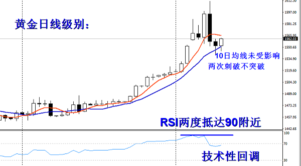 从日线级别来看,周四周、五两次跌破日线级别的10日均线支撑,但是收盘位置较高,均收于10日均线的上方,而周五更是开盘在10日均线附近,之后以此为支撑上涨,最终也是收线于1562一线,两日收线都较好,其实从日线级别来看,回调是技术性的回调,因为我们可以看到在周一、周三接连两次,日线级别RSI竟然抵达89一线,在大级别抵达89一线,这在历史行情中都是屈指可数的,所以冲高之后的回落,对再次上涨也就显得极为重要,而目前收线于10日均线的上方,也就说明整体多头走势完好,并没有受到此深调的影响。