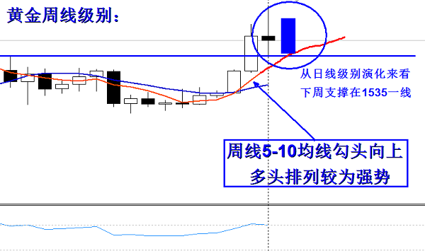 黄金从周线级别来看,目前依旧是强势行情,这个是没有任何问题的。5-10均线勾头向上,并且K线已经严重偏离5日均线处于5日均线的上方,强势毫无疑问。我们从周线级别可以看到下方的支撑,在1520附近,1520附近是下方5均线的支撑位置,距离现价还有40美金有余,此位置也是周线级别之前多次反弹高点位置,所以黄金最好的状态是能在回踩1520之后反弹向上,那么这是在上周的支撑位置,随着时间的推移,时间是可以换得空间的,此位置预计在1535附近,因为1535还是之前的一个高点位置,并且也是上周我们讲到的非波纳契线0.5的位置,所以黄金下周我觉得下方的极限支撑在1535~1530很难跌破此位置,并且大的方向看涨是毫无疑问的。唯一的区别就是,由之前的避险情绪高涨,现在别先情绪消退,回归技术层面,但是市面上充斥的突发性的避险情绪依旧存在。