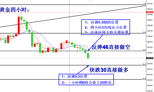 黄金在上周五小幅刺破1562之后,周一开盘并没有延续周五的上涨,而是自周一开盘后就一路下跌,目前我们要重新从日线级别出发分析这段行情的走势,目前日线级别5日均线已经严重勾头向下,10日均线有调转的趋势,4小时中1548是5日均线的压力位置,也是此波上涨行情回调0.382的位置,本为支撑,一旦跌破反做压力位,而下方回调0.5的位置在1530,所以今日下方的支撑在1530,反弹上方的压力在1548~1546一线,所以日内的操作期间也就比较明朗,上方反弹,1546~48一线直接进场空单,防守我们放在1552一线,也就是4小时10均线的压力位置上方,下方直接不回调式下跌至1530-29一线,直接再次进场多单,这里需要注意的是,直接下跌到1530~29,而不是日内的慢跌,如果日内的慢跌,那这种行情大概率要走延续,跌跌涨涨的行情是健康的,如果早盘急跌至此为止,我们可以直接进场做反弹的多单。