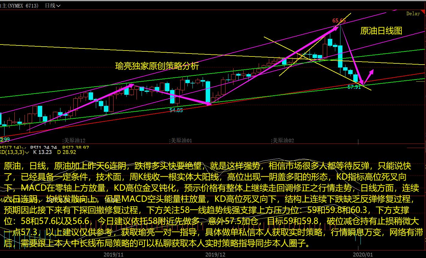 原油,日线,原油加上昨天6连阴,跌得多头快要绝望,就是这样强势,相信市场很多人都等待反弹,只能说快了,已经具备一定条件,技术面,周K线收一根实体大阳线,高位出现一阴盖多阳的形态,KD指标高位死叉向下,MACD在零轴上方放量,KD高位金叉钝化,预示价格有整体上继续走回调修正之行情走势,日线方面,连续六日连阴,均线发散向上,但是MACD空头能量柱放量,KD高位死叉向下,结构上连续下跌缺乏反弹修复过程,预期因此接下来有下探回撤修复过程,下方关注58一线趋势线强支撑上方压力位:59和59.8和60.3,下方支撑位:58和57.6以及56.6,今日建议依托58附近先做多,意外57.5加仓,目标59和59.8,破位减仓持有止损稍微大一点57.3,以上建议仅供参考,获取瑜亮一对一指导,具体做单私信本人获取实时策略,行情瞬息万变,网络有滞后,需要跟上本人中长线布局策略的可以私聊获取本人实时策略指导同步本人圈子。
