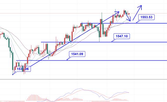 黄金早盘遇阻1560压力位置后回落,当前受到1550位置的支撑,黄金还是震荡上行走势没有改变,黄金维持1540-1565区域内盘整震荡,当前走反弹上涨段,震荡上行模式,虽然有回踩,但是反弹走势没有改变,还是要继续多,欧盘1550上继续多!