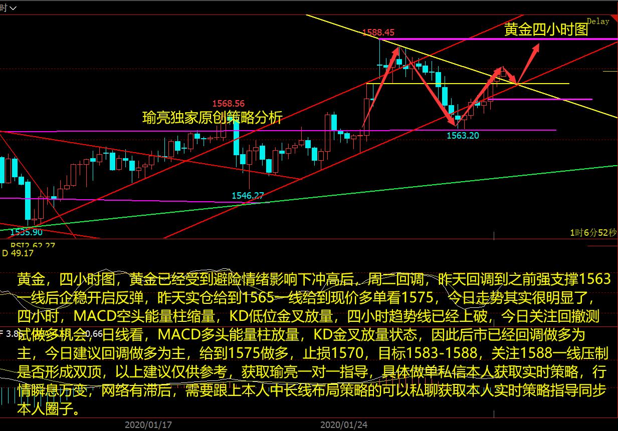 黄金,四小时图,黄金已经受到避险情绪影响下冲高后,周二回调,昨天回调到之前强支撑1563一线后企稳开启反弹,昨天实仓给到1565一线给到现价多单看1575,今日走势其实很明显了,四小时,MACD空头能量柱缩量,KD低位金叉放量,四小时趋势线已经上破,今日关注回撤测试做多机会,日线看,MACD多头能量柱放量,KD金叉放量状态,因此后市已经回调做多为主,今日建议回调做多为主,给到1575做多,止损1570,目标1583-1588,关注1588一线压制是否形成双顶,以上建议仅供参考,获取瑜亮一对一指导,具体做单私信本人获取实时策略,行情瞬息万变,网络有滞后,需要跟上本人中长线布局策略的可以私聊获取本人实时策略指导同步本人圈子。