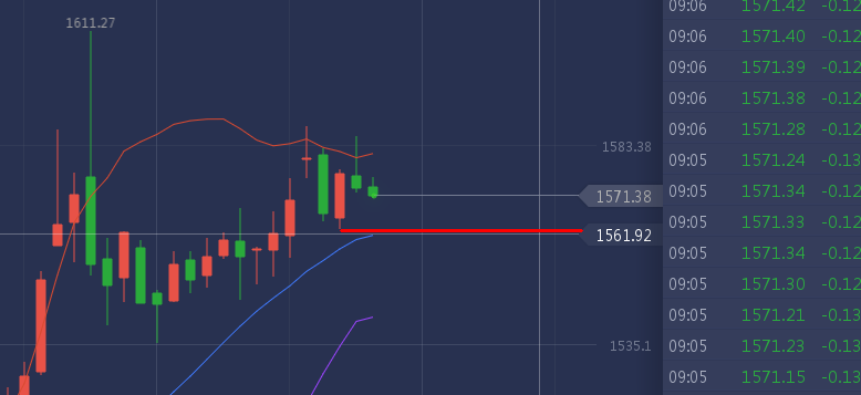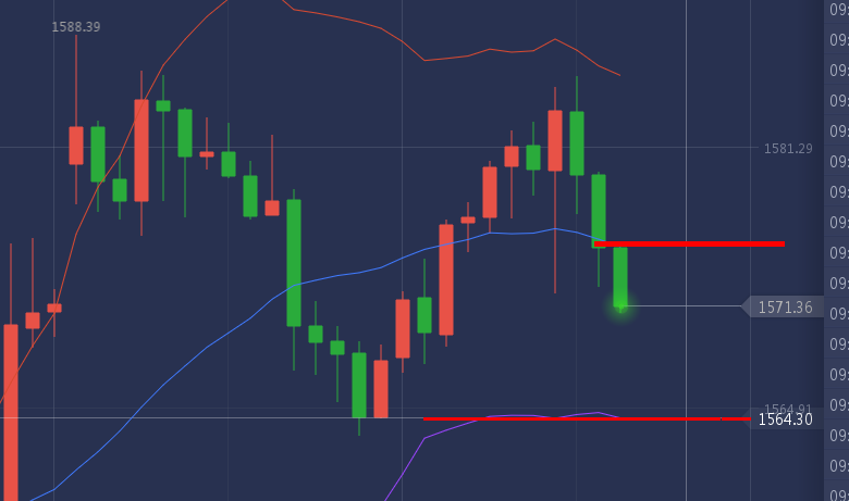 黄金现价1571.6附近,黄金4小时图布林轨的指标来看,今日还能延续空头至1563附近,日图看也是空头。昨晚收盘破日内低点,日图收阴,今日就会延续空头行情,今日的行情逢高空,周睿金建议空单等到反弹至1574附近进场,止损1580,目标看1565-1560.