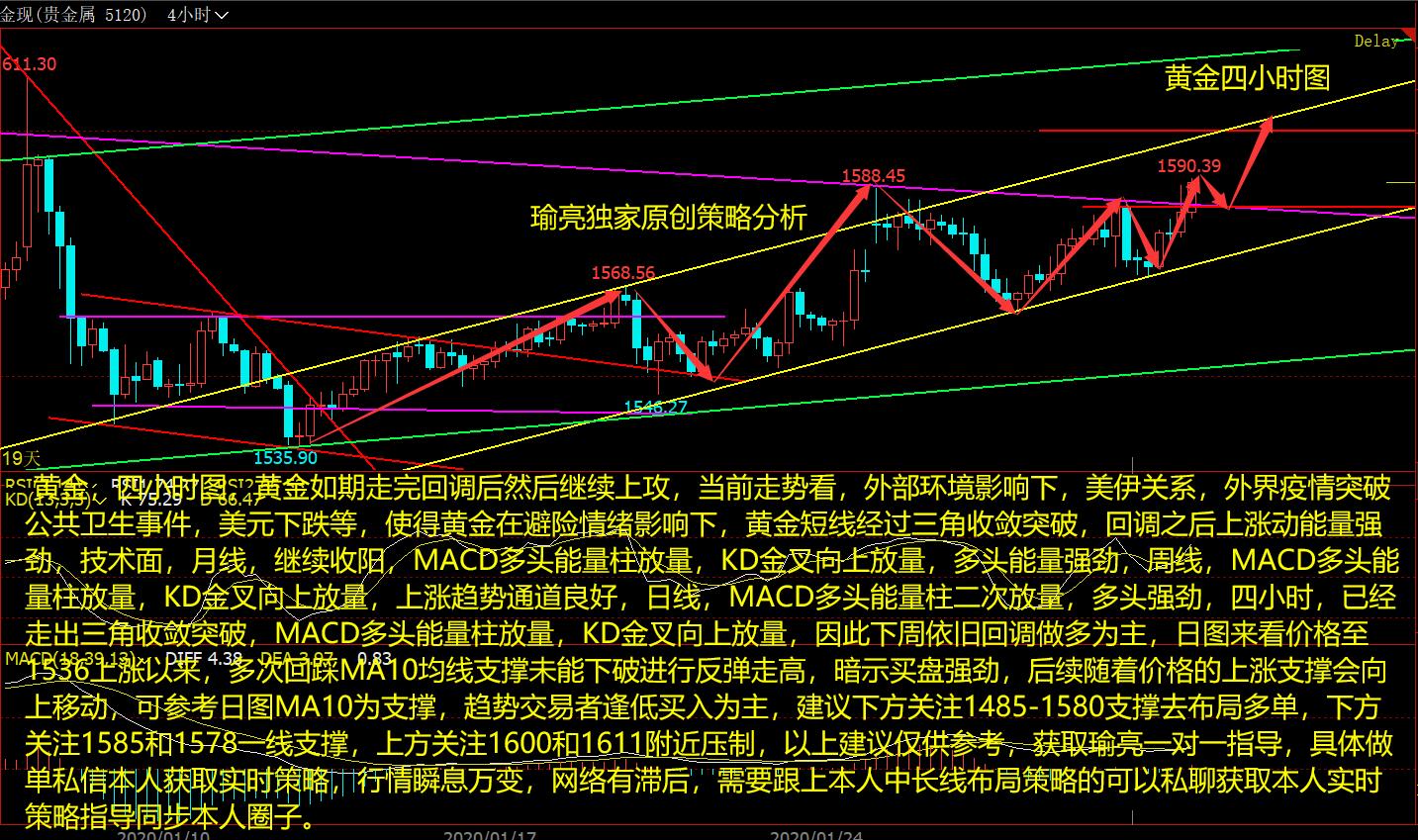 黄金,四小时图,黄金如期走完回调后然后继续上攻,当前走势看,外部环境影响下,美伊关系,外界疫情突破公共卫生事件,美元下跌等,使得黄金在避险情绪影响下,黄金短线经过三角收敛突破,回调之后上涨动能量强劲,技术面,月线,继续收阳,MACD多头能量柱放量,KD金叉向上放量,多头能量强劲,周线,MACD多头能量柱放量,KD金叉向上放量,上涨趋势通道良好,日线,MACD多头能量柱二次放量,多头强劲,四小时,已经走出三角收敛突破,MACD多头能量柱放量,KD金叉向上放量,因此下周依旧回调做多为主,日图来看价格至1536上涨以来,多次回踩MA10均线支撑未能下破进行反弹走高,暗示买盘强劲,后续随着价格的上涨支撑会向上移动,可参考日图MA10为支撑,趋势交易者逢低买入为主,建议下方关注1485-1580支撑去布局多单,下方关注1585和1578一线支撑,上方关注1600和1611附近压制,以上建议仅供参考,获取瑜亮一对一指导,具体做单私信本人获取实时策略,行情瞬息万变,网络有滞后,需要跟上本人中长线布局策略的可以私聊获取本人实时策略指导同步本人圈子。